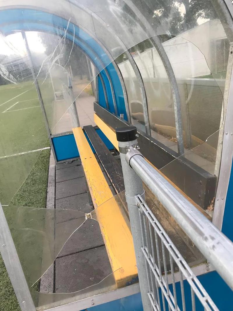 Tafels gesloopt en beklad, ramen van een Dug-Out ingeslagen, container vernield, noodverlichting/buitenlampen van de muur gesloopt en bewakingscamera’s vernield. Naar het schijnt zijn er reeds enkele namen bekend, maar nog niet iedereen heeft zicht gemeld. Ouders wordt daarom verzocht contact met de vereniging op te nemen. De foto’s van de aangerichte schade liegen er niet om!