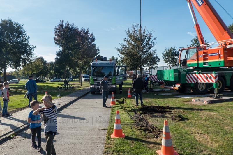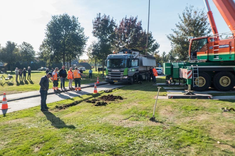 De vrachtwagen beladen met zwarte grond, moest de zijkanten van het fietspad opvullen, zodat het weer mooi vlak zou zijn. Helaas voor de chauffeur, werd het iets anders dan gedacht. De vrachtwagen met een gewicht van circa 30 ton, zakte helemaal weg in de berm langs het fietspad.vrachtwagen Koriander