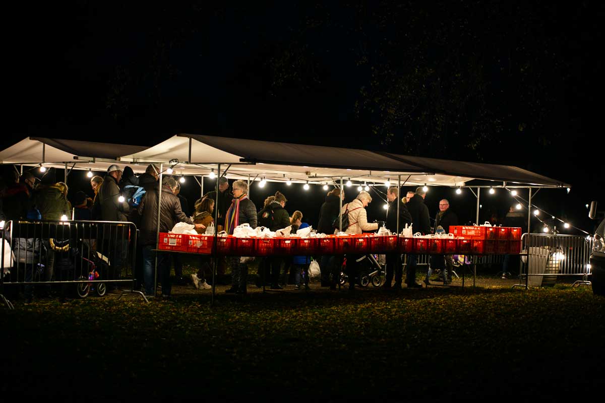 In het centrum van Klazienaveen gaat er een soort viering aan vooraf in de RK Kerk omdat het van oudsher een katholiek feest betreft. Na deze viering gaan de kinderen met ouders en/of verzorgers in een grote, kleurrijke en gezellige optocht onder begeleiding van een drumband door het centrum op weg naar het terrein bij het Esdal College waar de zakjes met allerlei snoepgoed en gezonde dingen uitgedeeld worden.
