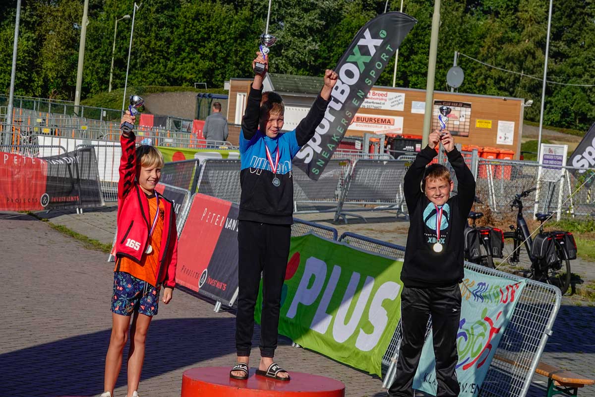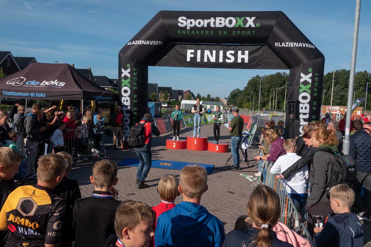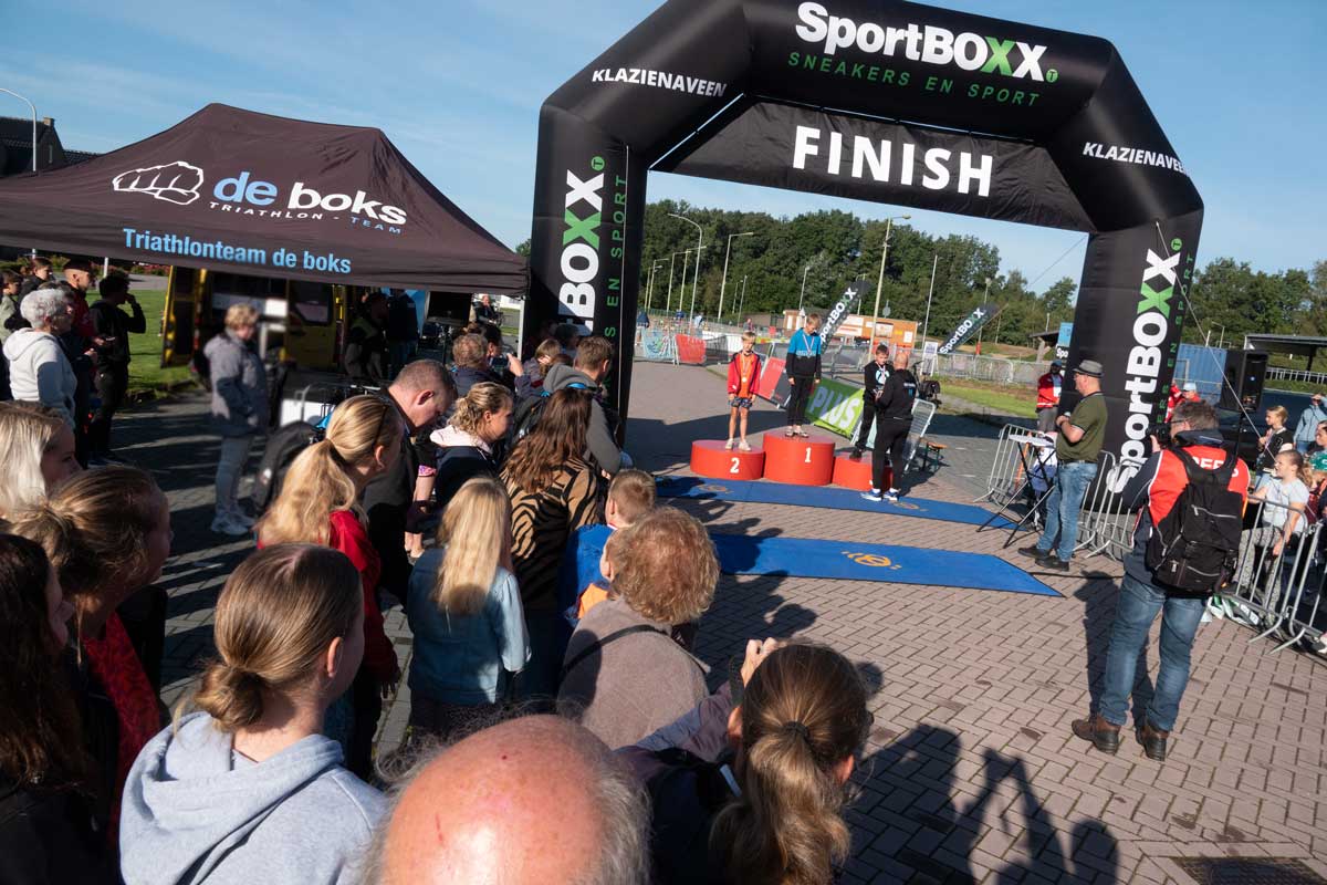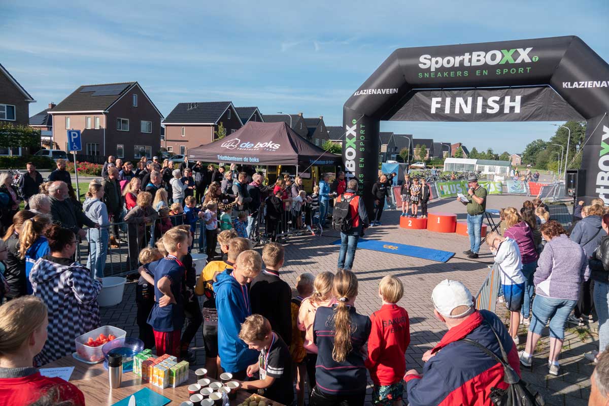 Het was de eerste Kindertriathlon die op een zelfstandige wijze, los van de grote Triathlon Klazienaveen, gehouden werd. De wedstrijdverslaglegging en prijsuitreikingen werd keurig aaneen gepraat door Harold Stuiver van de lokale Toneelgroep Kruidenveld. Dankzij de vele vrijwilligers werd het een geslaagd evenement. Meer foto’s vind u onderaan.